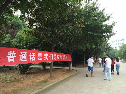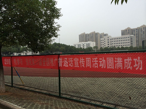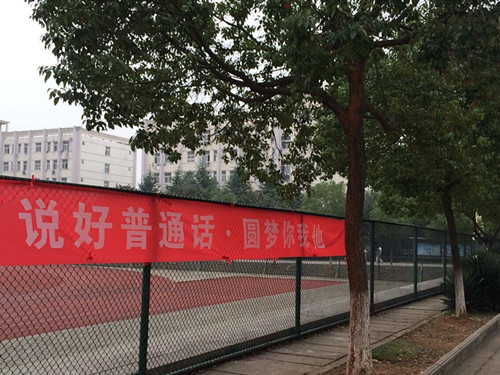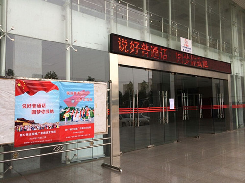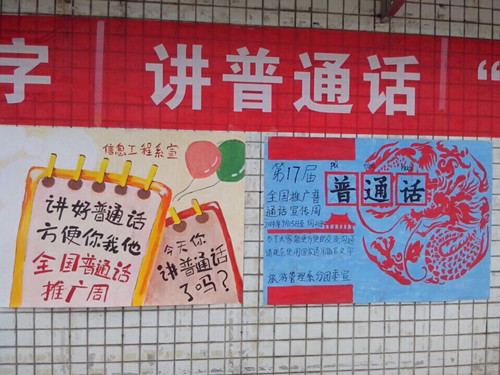 1.为了营造积极良好的推普氛围,充分利用学校的电子屏全天候轮流滚动播放推普标语;在学院主要位置悬挂“说好普通话圆梦你我他”、“