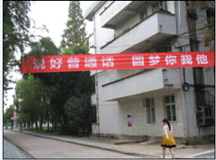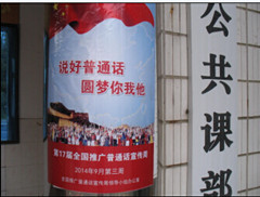 1、在校园主干道悬挂推普条幅。我们在中区主干道、北区、南区和东区教学楼分别悬挂了4条条幅。还在校园张贴第十七届推普宣传画30张之多,使整个校园充满推普周的推普氛围,起到了较好的宣传、教育和熏染效果。