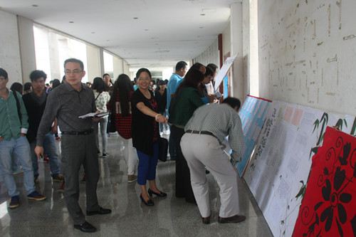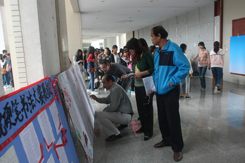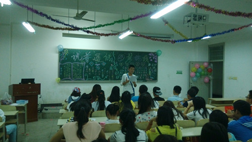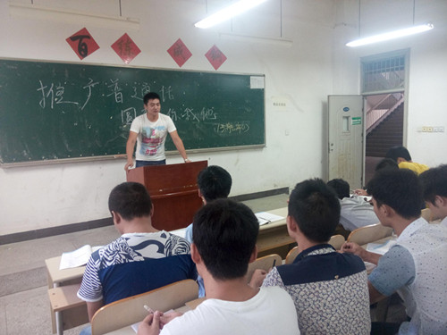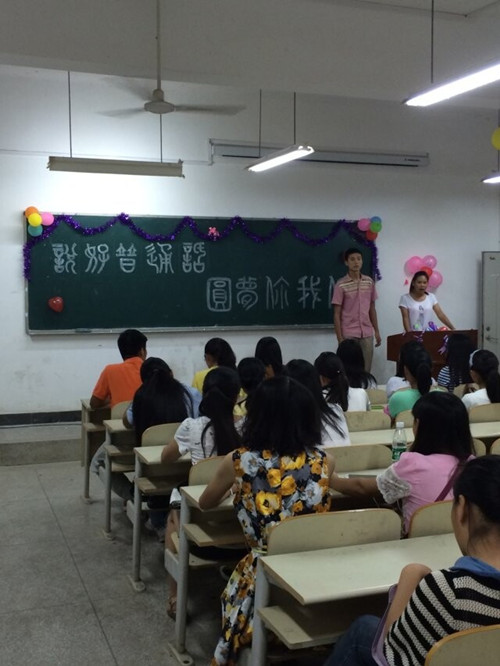 5.在校学生工作部、团委的组织下以班级为单位举行 “说好普通话,圆梦你我他”主题班会活动。其中汽车工程学院组织各班进行汉字听写大赛,比赛现场气氛热烈,这次班会让他们意识到了汉字是中华文化最重要的标志,不能因为电脑时代的到来让汉字式微,以后要勤写汉字,勤讲规范语音,让中华文化在汉字和语音中传承与弘扬。