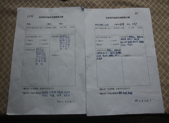 8、开展“汉字纠错”活动。在教室内,对黑板报、学习园地、作业等进行检查,发现不规范用字马上予以纠正;对校园内外的标牌、店牌、指示牌、广告牌等不规范用字、病句进行调查,并做好调查记录,以便通过正当程序督促相关单位和个人整改。
