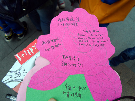 9、组织一次“小手牵大手,同讲普通话”活动。学校通过校讯通或发放致家长的一封倡议书等形式,在“推普周”期间,倡议学生和家长将普通话作为家庭用语,发挥学生作为推广普通话的示范员、宣传员和监督员作用,以学生带动家庭,以学校带动社会,使普通话由校园语言迈向家庭生活语言和社会语言。