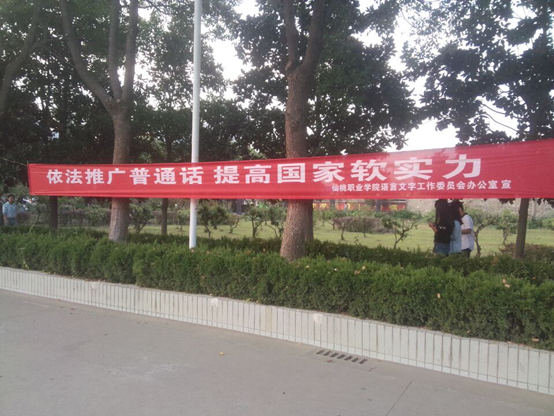 1、在学院主干道上悬挂第18届全国推普周宣传横幅3条:“依法推广普通话 提高国家软实力”;“掌握一种语言就是掌握了通往一国文化的钥匙”。