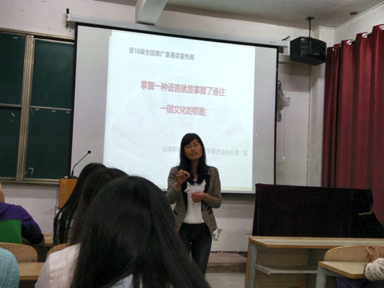三、以具体活动为依托,将推广普通话工作落在实处,切实让全院师生受益,从而提高推普意识与推普成效。推普周期间,在全院范围内组织一次讲座。9月18日晚7:00,尽管到了周五,而且还正下着一场秋雨,天气也很凉,但来自艺术与传媒学院、学前教育学院等六个不同的院系和学生社团组织的学生齐聚一堂,认真聆听了一场题为“诵读,丰盈我们的人生”的讲座。由学前教育学院的熊芬副院长主讲。她的讲解声情并茂、深入浅出,同学们颇为受益。她分别从什么是诵读;诵读与人生;诵读方法等三个方面切入,让同学们明白,可以利面构建画面;把握节奏;设计情感线等具体的诵读方法上入手体会中华文字之美。诵读可以让人走向精致,诵读可以让人走向厚重,同时,诵读也可让人体会不一样的人生,能让人们的心灵变得更为丰富。借以倡导学生,热爱诵读,热爱祖国的优美文字。