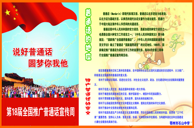 2015年9月14日—20日是第18届全国推广普通话宣传周,鄂州市语委按照全省统一部署,扎实有效地开展了各类活动,取得了良好效果, 现总结如下:
