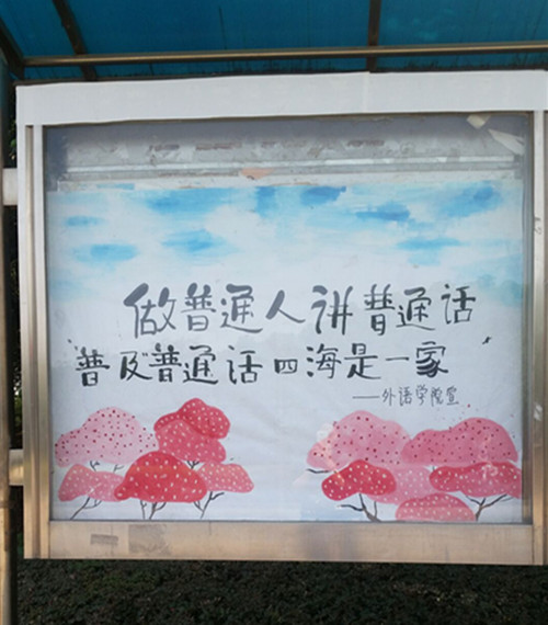 二、我校积极宣传普通话推广周活动,统一在各学院办公室放置“请说普通话”告示牌提醒教职工、学生使用普通话交流,促使大家形成说普通话的习惯。同时利用校园网站、橱窗、广播台、微博、校报等平台发布在校园推广普通话倡议,通过多种宣传方式,营造推普气氛,扩大推普影响。