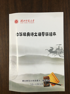 为了传承中华经典文化,弘扬中华文明精神。我们组织编写了《中华经典诗文诵写讲读本》,收录了60篇中华经典诗文,既有古代诗文《洛神赋》、《兰亭集序》、《木兰辞》,又有现代诗文《致橡树》、《青衣》、《鸟的天堂》等,我们希望通过《中华经典诗文诵写讲读本》的推广,丰富学生业余生活,营造校园人文气息。此读本将用于10月中旬即将举行的“湖师大2016年度经典诗文诵读决赛”的蓝本,本次比赛将采取集体朗诵形式,预赛已于上半年5月举行,每个学院都精心策划与准备了活动,学生参与性也很高,此次比赛将做为我校下半年语言文字工作的重头戏,让我们拭目以待学生们的精彩演绎。