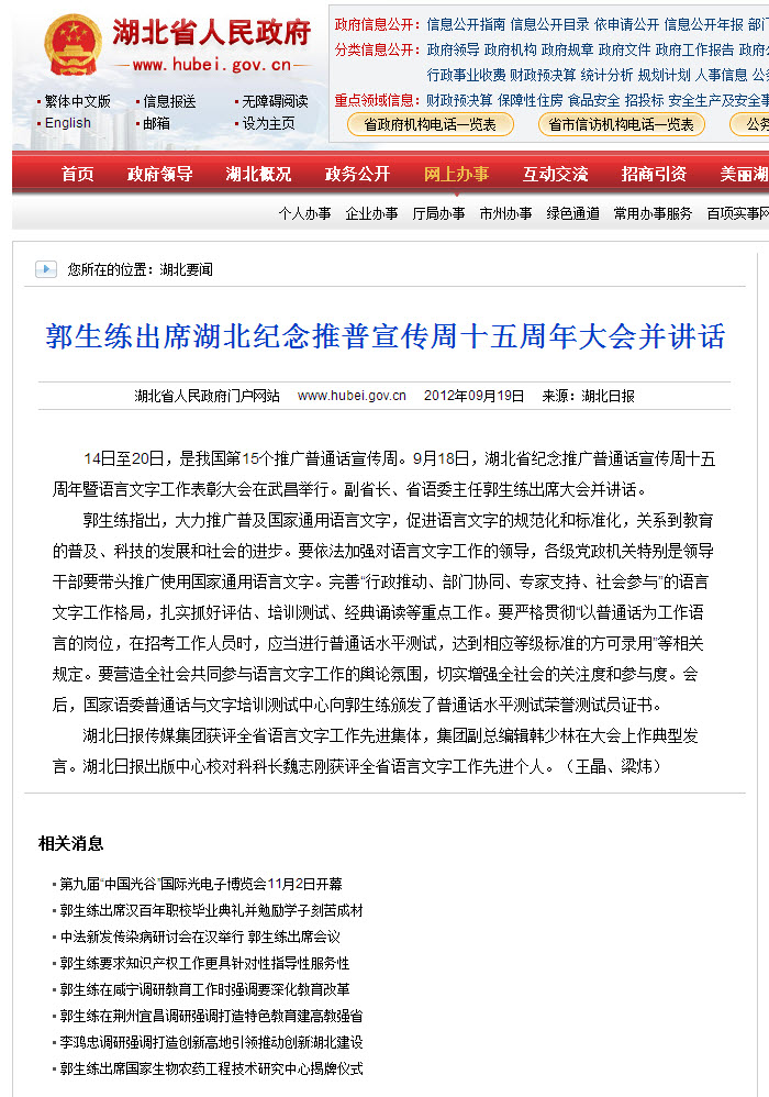 湖北省人民政府门户网站:郭生练出席湖北纪念推普宣传周十五周年大会并讲话