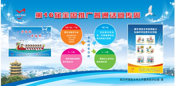 ●东湖高新技术开发区各示范岗、窗口行业等单位,积极开展“四个一”的活动:组织一次推普周宣传材料的学习活动;开展一次用字用语环境氛围的自查整改活动;举办一次围绕推普主题的普通话演讲比赛;悬挂一条推普宣传标语。同时,采取张贴宣传画、悬挂宣传横幅、利用LED滚动宣传用语、设置专题宣传栏等方式,积极营造语言文字规范化应用工作的宣传环境。